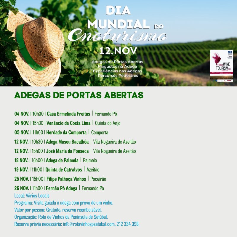 Ermelinda Freitas, Venâncio da Costa Lima, HERDADE DA COMPORTA, Bacalhôa, José Maria da Fonseca, Adega de Palmela, Quinta de Catralvos, Filipe Palhoça Vinhos e Fernão Pó Adega estão à sua espera de portas abertas. ![]()